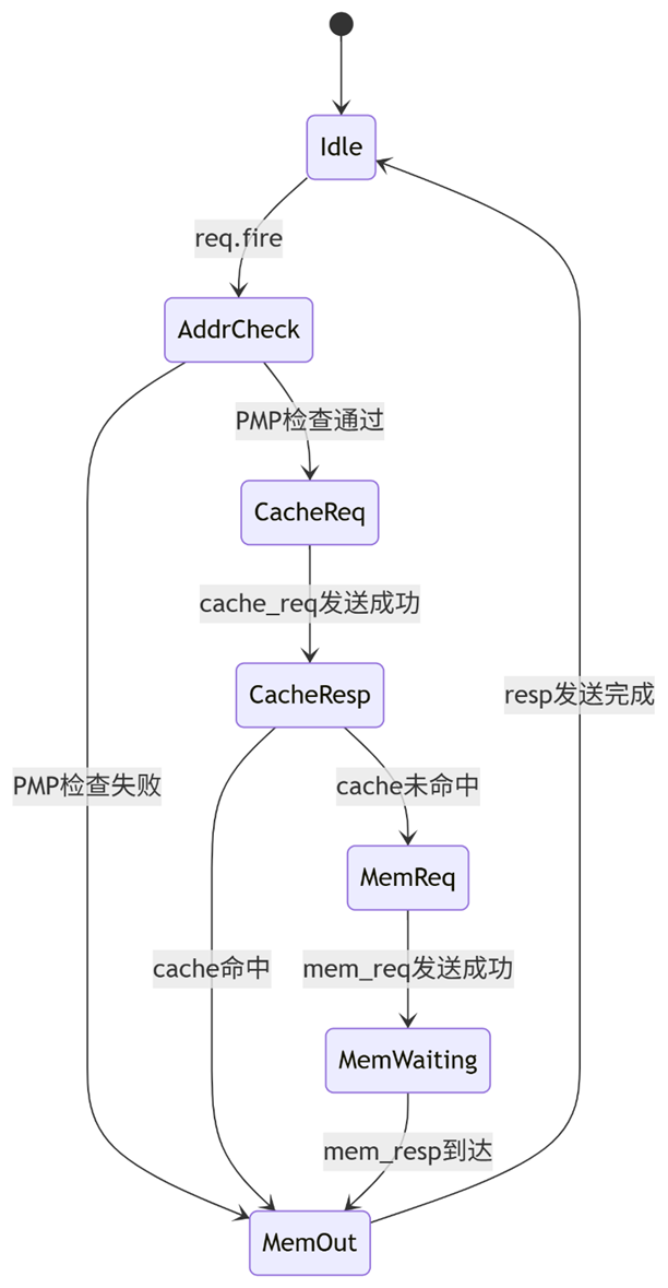 | state_idle | 标明该fsm状态为空,可以录入新请求 当io.req.fire时,切换到新状态 转换条件: