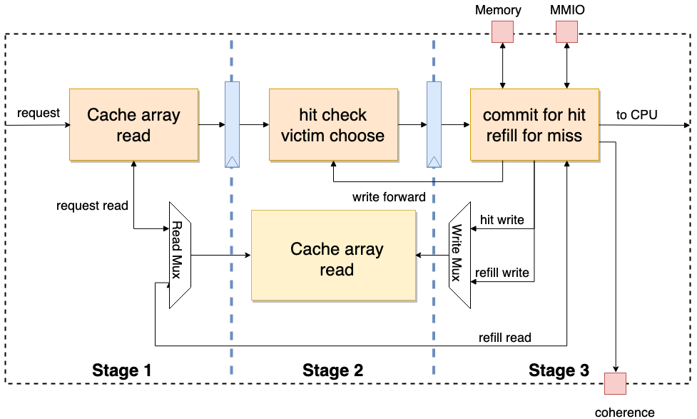 果壳 cache(Nutshell Cache)是果壳处理器中使用的缓存模块。其采用三级流水设计,当第三级流水检出当前请求为 MMIO 或者发生重填(refill)时,会阻塞流水线。同时,果壳 cache 采用可定制的模块化设计,通过改变参数可以生成存储空间大小不同的一级 cache(L1 Cache)或者二级 cache(L2 Cache)。此外,果壳 cache 留有一致性(coherence)接口,可以处理一致性相关的请求。